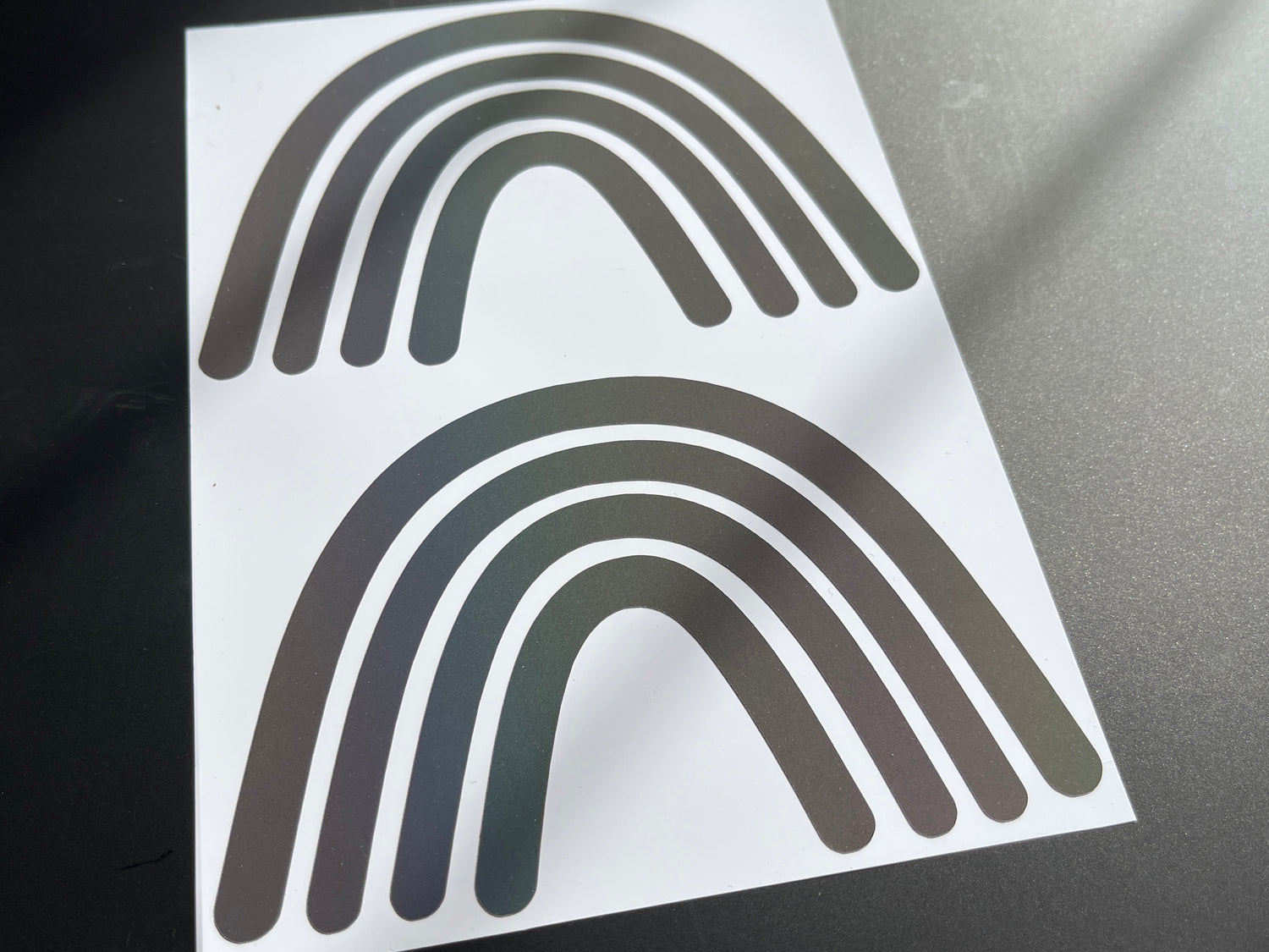 All stickers are totally waterproof, and can be used in all weathers. Vinyls reflect back light in their respective colours, excluding black which reflects back an off-white light.