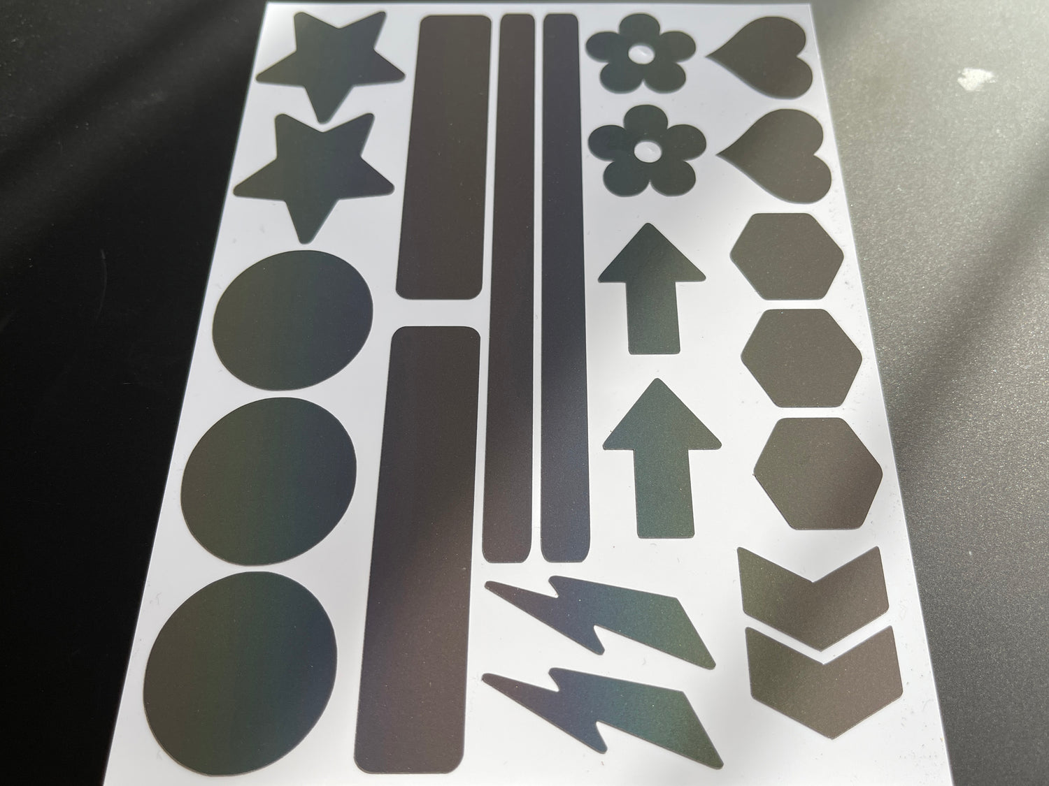 All stickers are totally waterproof, and can be used in all weathers. Vinyls reflect back light in their respective colours, excluding black which reflects back an off-white light.