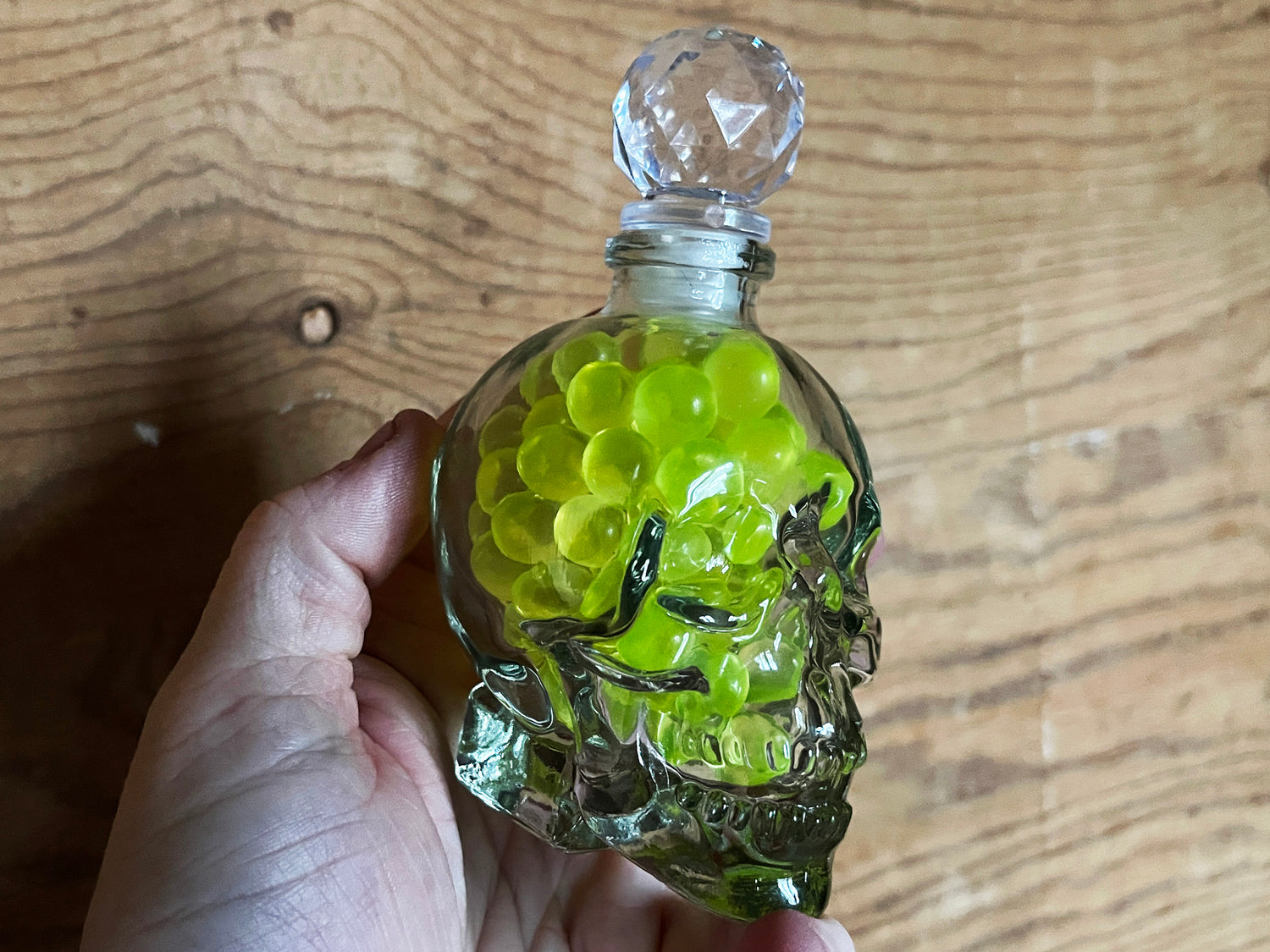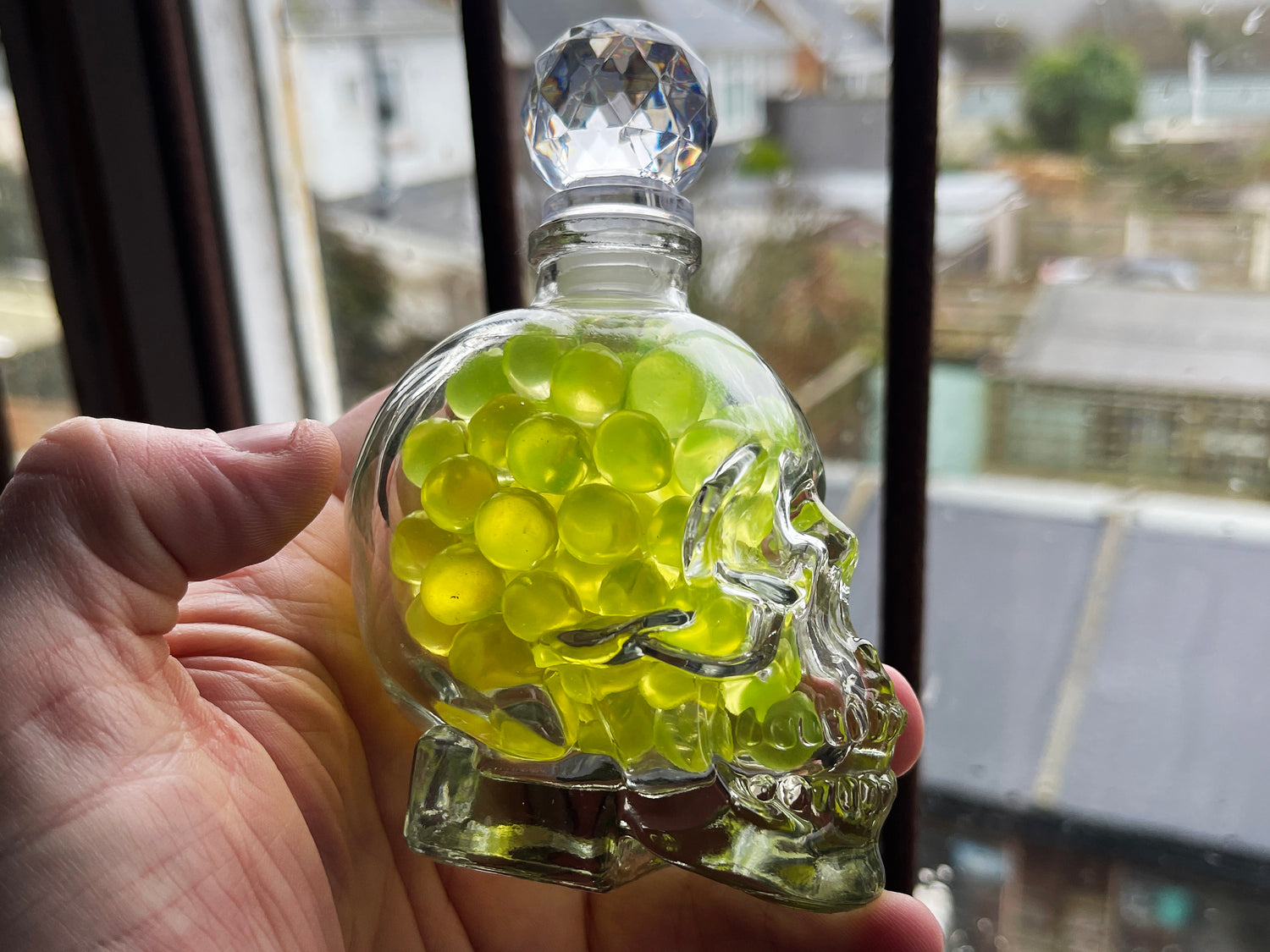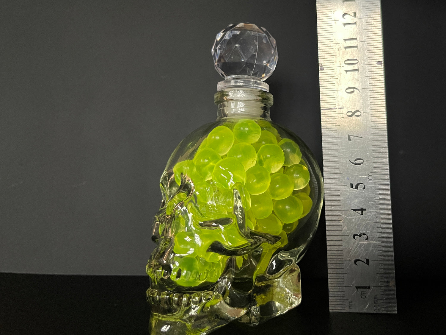 Uranium Glass Marble Filled Skull Whisky Decanter