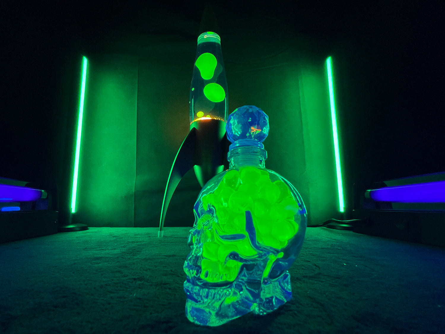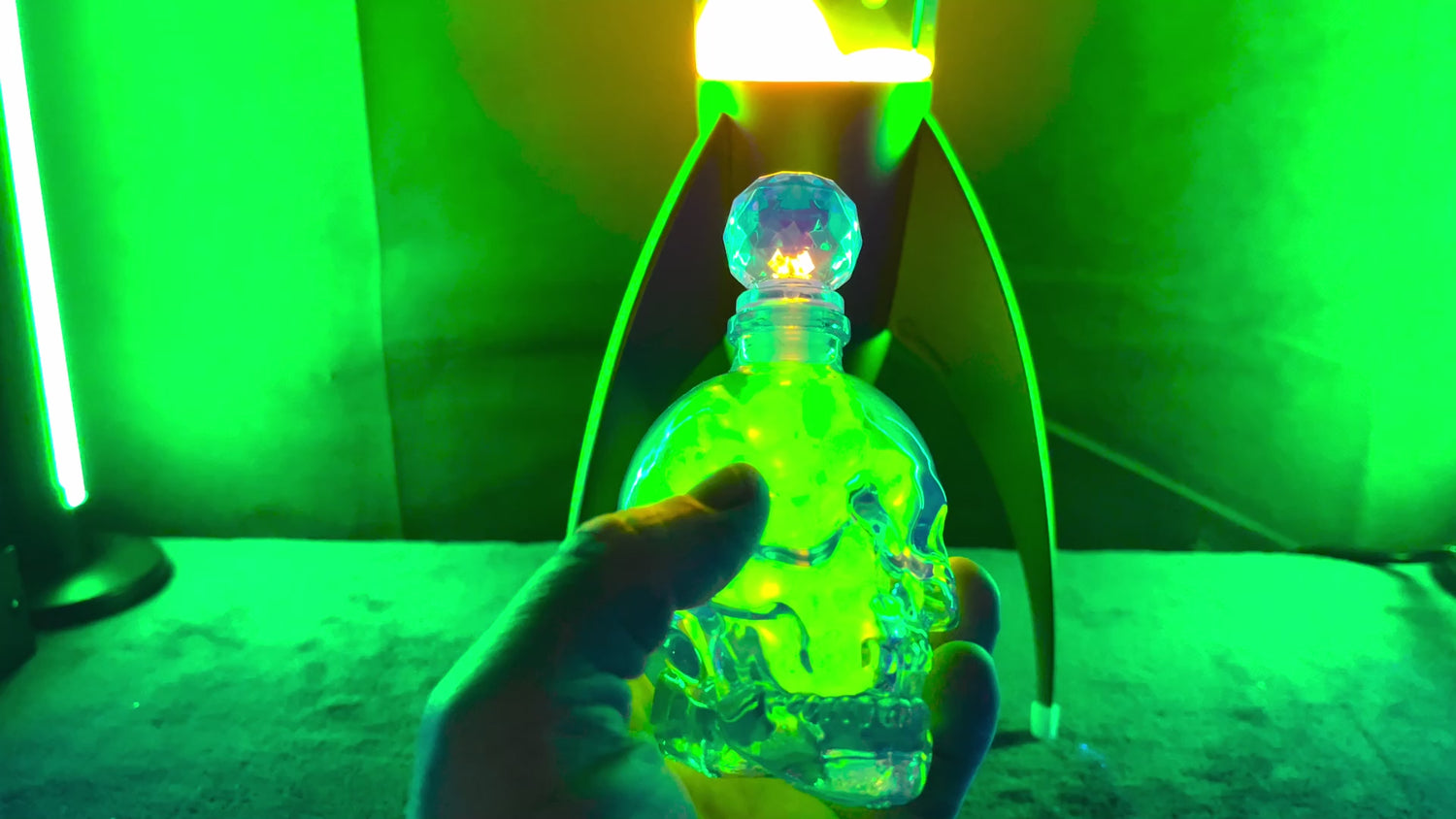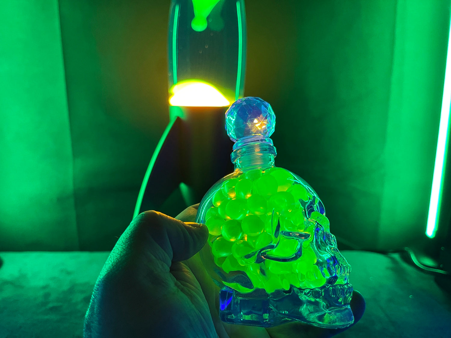 Uranium Glass Marble Filled Skull Whisky Decanter