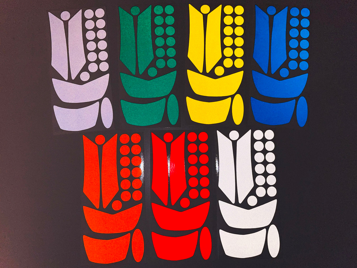 All stickers are totally waterproof, and can be used in all weathers.  Vinyls reflect back light in their respective colours, excluding black which reflects back an off-white light.